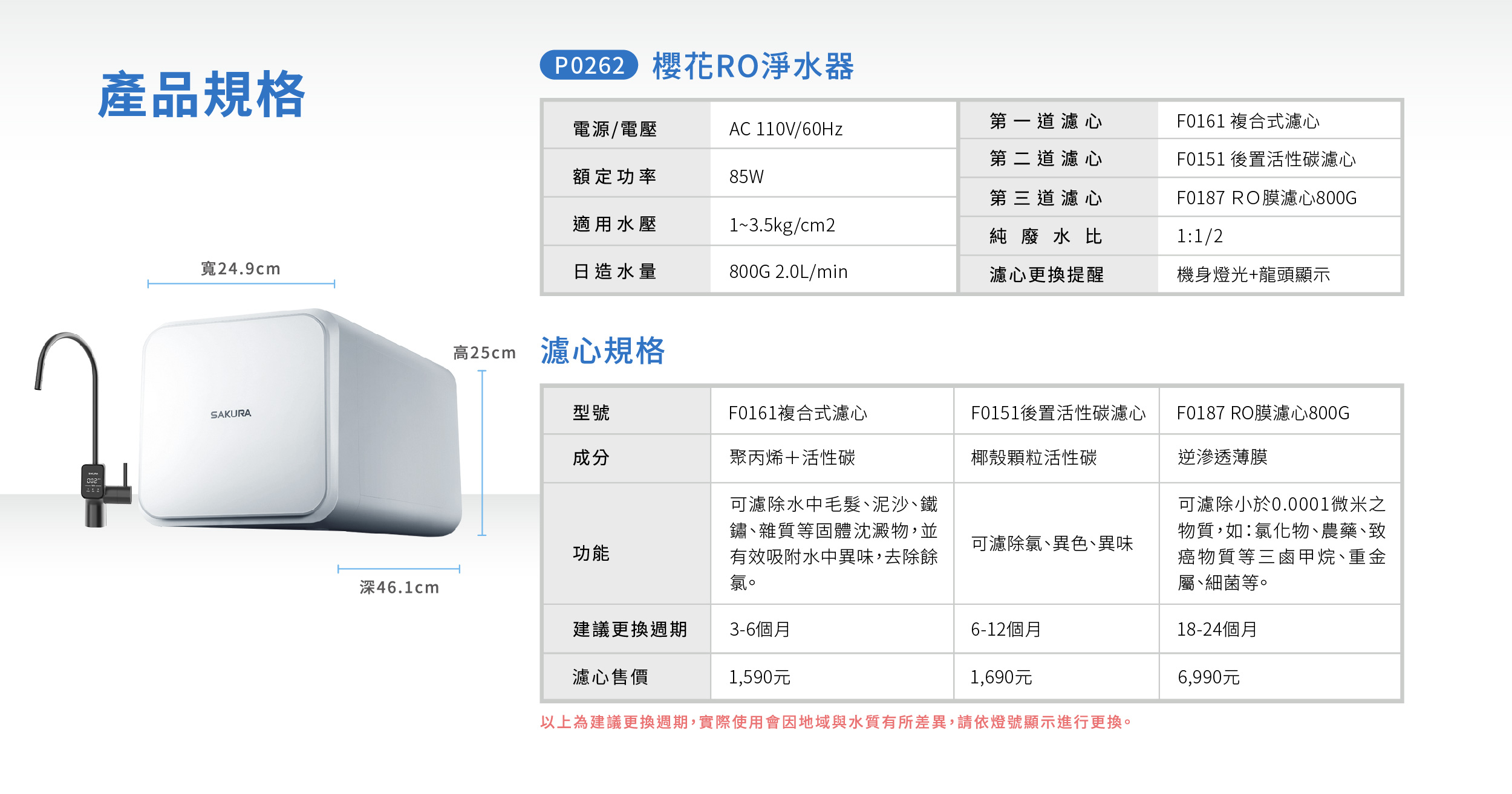 主機尺寸(寬 x 深 x 高) 249 x 461 x 250mm 主機淨重(含濾材) 10.4Kg 過濾方式 3道式 第一道濾材(建議更換週期) F0161 複合式濾心 (3~6個月) 第二道濾材(建議更換週期) F0151 後置活性碳濾心 (6~12個月) 第三道濾材(建議更換週期) F0187 RO膜濾心(800G) (24~30個月) 廢水排放控制 純水與廢水比例1:1/2 適用水壓 1~3.5 kg/cm2(15~50psi) 適用溫度 5~38℃ 電源規格 110V/60Hz 配件包 3分/2分PE管、進水開關、智慧鵝頸龍頭組、排水閥、減壓閥、產品說明書、回函卡、維護卡 安全保障 通過SGS水質檢測達國家級飲用水標準 *註1:本產品除串接櫻花熱飲機之外,其他產品(例如:冰箱)皆須加裝穩壓器(C95-A463小儲水桶)使用。*註2:本產品如要串接熱飲機,建議串接櫻花牌產品,同時留意串接距離長度,勿過長以確保使用效果。 如串接其他廠牌設備,須依實際情況與環境條件確認,無法保證與本產品搭配之適用性。 環境保護