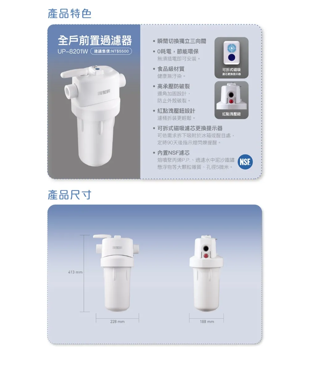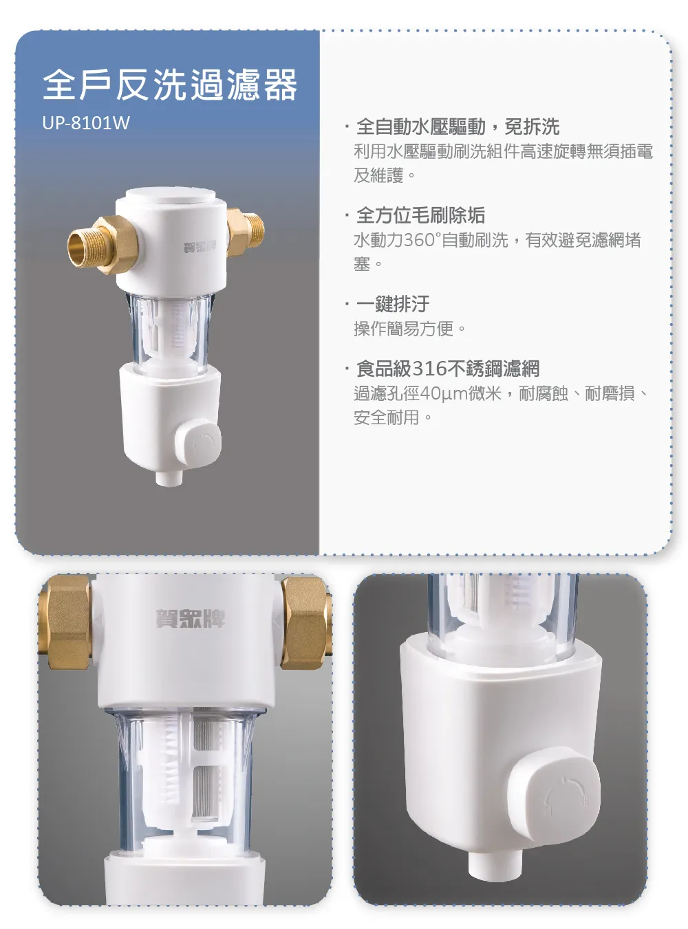 首頁 > 商品介紹 > 賀眾牌 全戶反洗+前置過濾器組合(UP-8101W+UP-8201W)