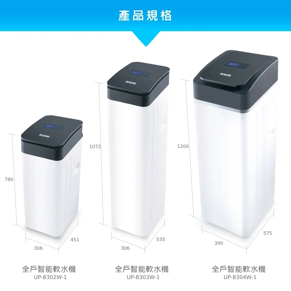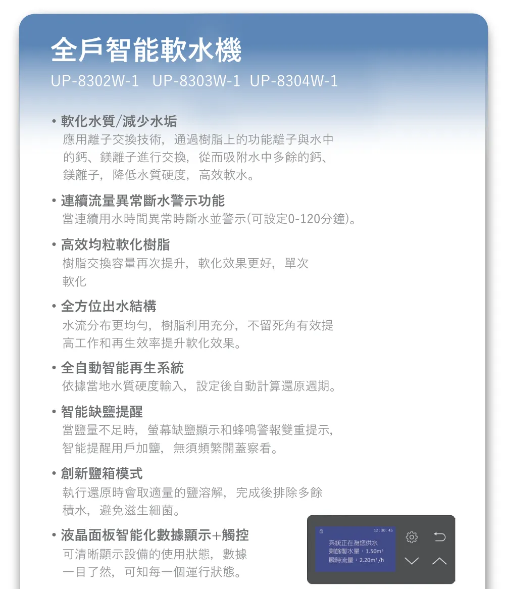 首頁 > 商品介紹 > 賀眾牌 3T全戶智能軟水機組合(UP-8101W+UP-8201W+UP-8303W)