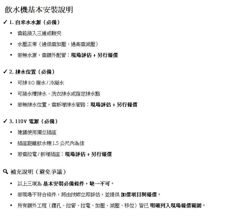 | 基本安裝費 | NT$2,000(不含鑿洞、穿孔及電源線配置) |