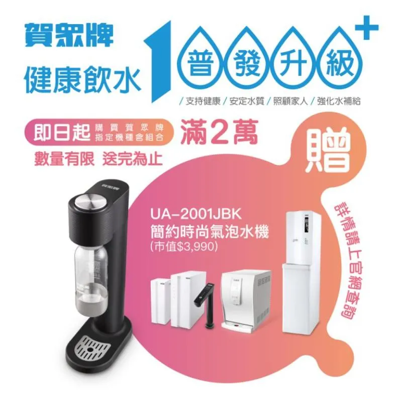 單筆消費滿 $20,000 直接送你 UA-2001JBK 時尚氣泡水機(市值 $3,990)!
